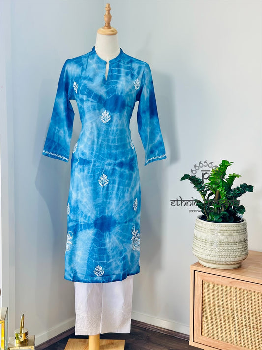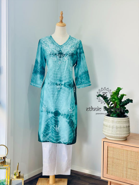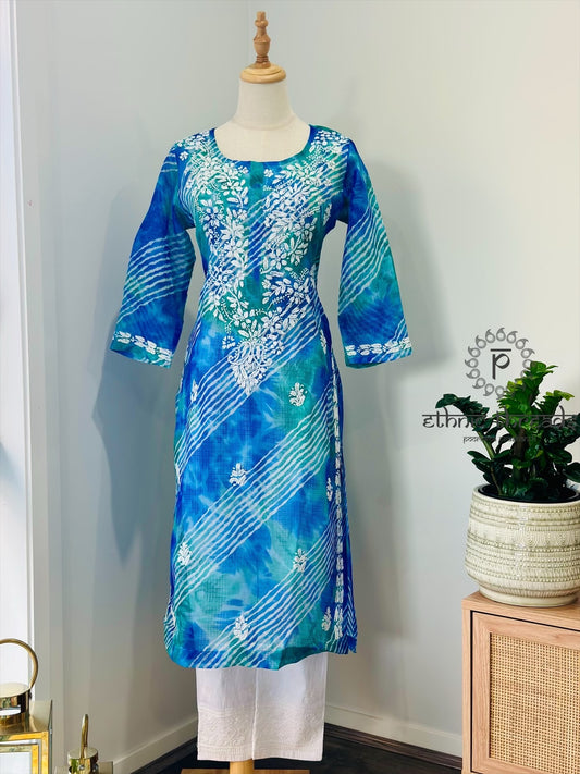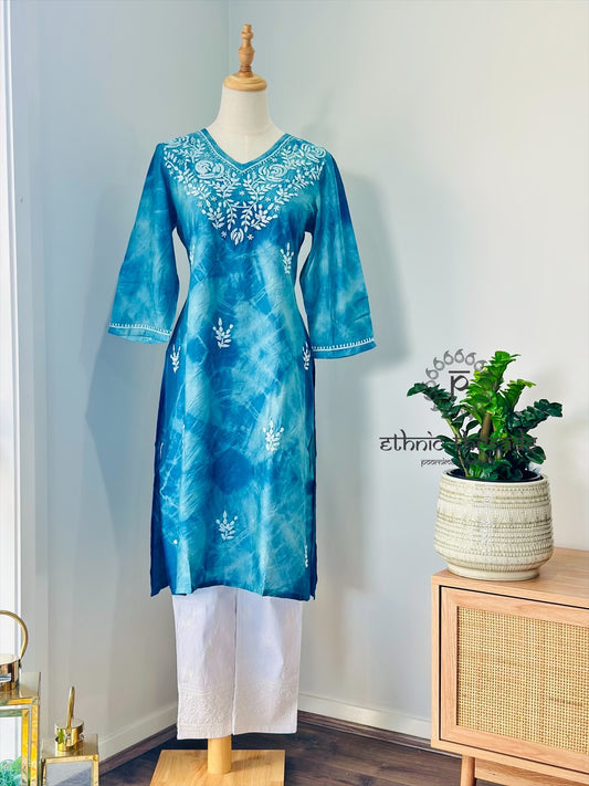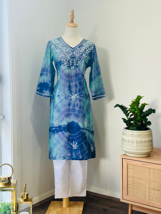 Chikankari Kurta In Tie-Dye Silk Cotton -Teal/Blue