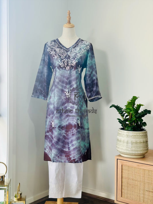 Chikankari Kurta In Tie-Dye Silk Cotton -Teal/Purple