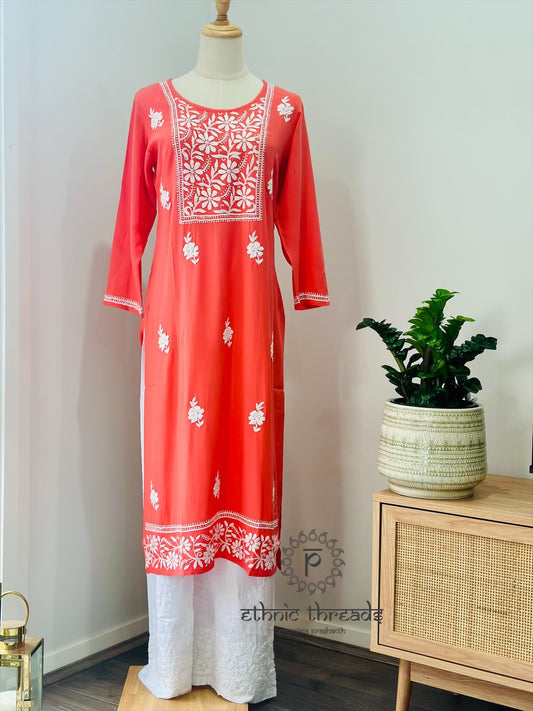 Lucknowi Chikankari Cotton Women's Flared Short Kurta - Peach