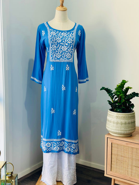 Chikankari Long Kurta In Muslin - Blue