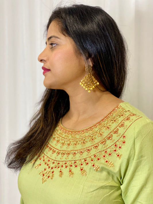 Pastel Green Embroidered Cotton Anarkali Style Kurti