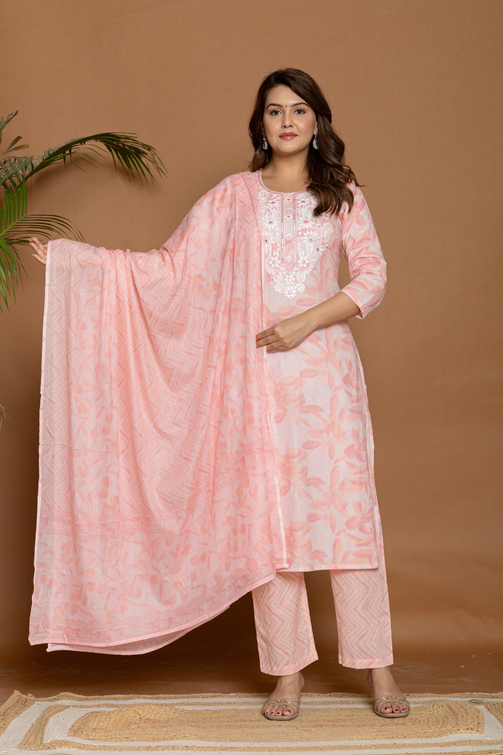 Effortlessly elegant — this babt pink cotton suit set features intricate all-over prints and neck line embroidery that bring a fresh festive charm. The straight-cut kurta comes with 3/4th sleeves and delicate detailing, paired with matching printed bottoms for a coordinated look. The soft, beautifully patterned dupatta completes the outfit with a graceful touch.
