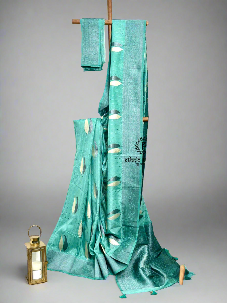 Grace meets tradition in this stunning Banarasi Crepe Saree, crafted to bring out effortless elegance. The smooth, flowy crepe fabric drapes beautifully, while the intricate zari-woven Banarasi borders add a touch of regal charm.