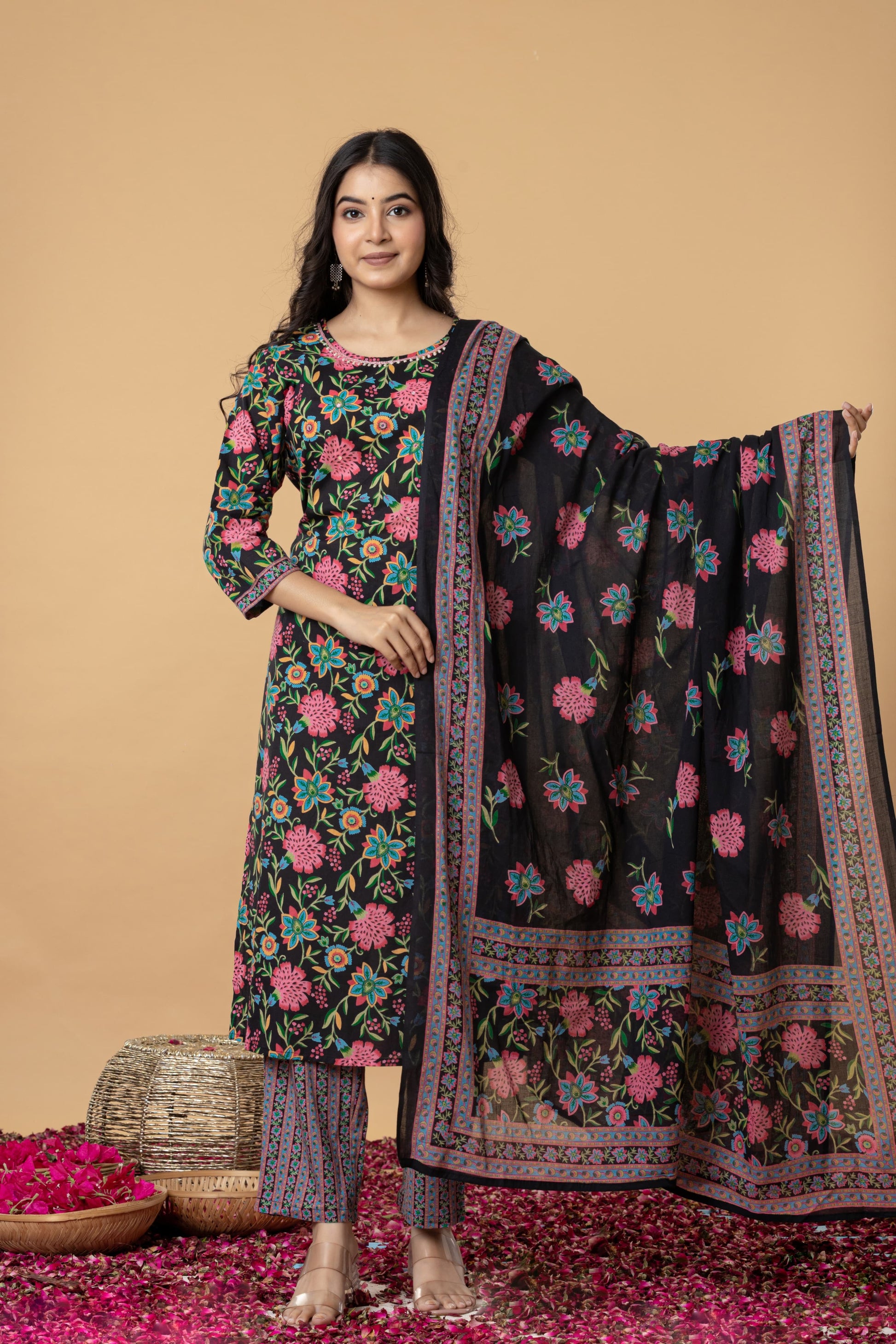 Effortlessly elegant — this black floral printed cotton suit set features intricate all-over prints and neck line embroidery that bring a fresh festive charm. The straight-cut kurta comes with 3/4th sleeves and delicate detailing, paired with matching printed bottoms for a coordinated look. The soft, beautifully patterned dupatta completes the outfit with a graceful touch.