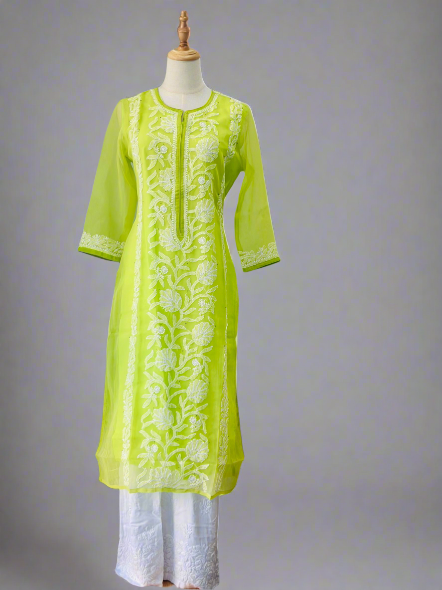 Introducing our elegant Long Chikankari Kurta, beautifully handcrafted in fine Georgette. Inspired by soft morning breezes and golden sunlight, this kurta blends timeless Chikankari embroidery with a flowing, airy silhouette for all-day comfort and effortless grace.