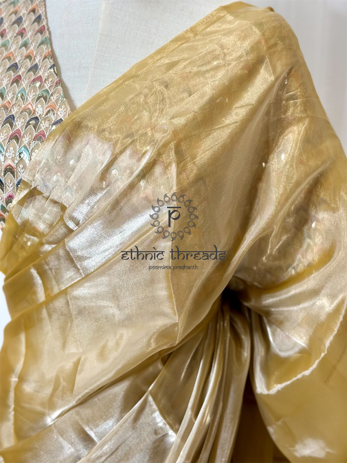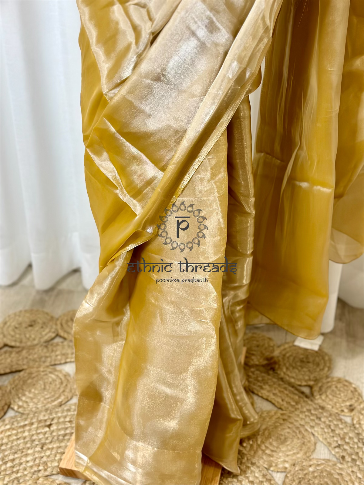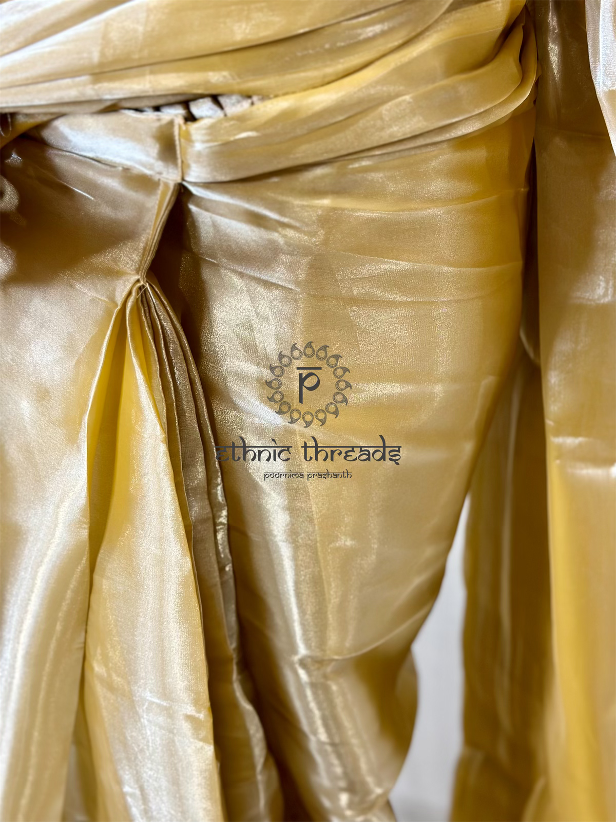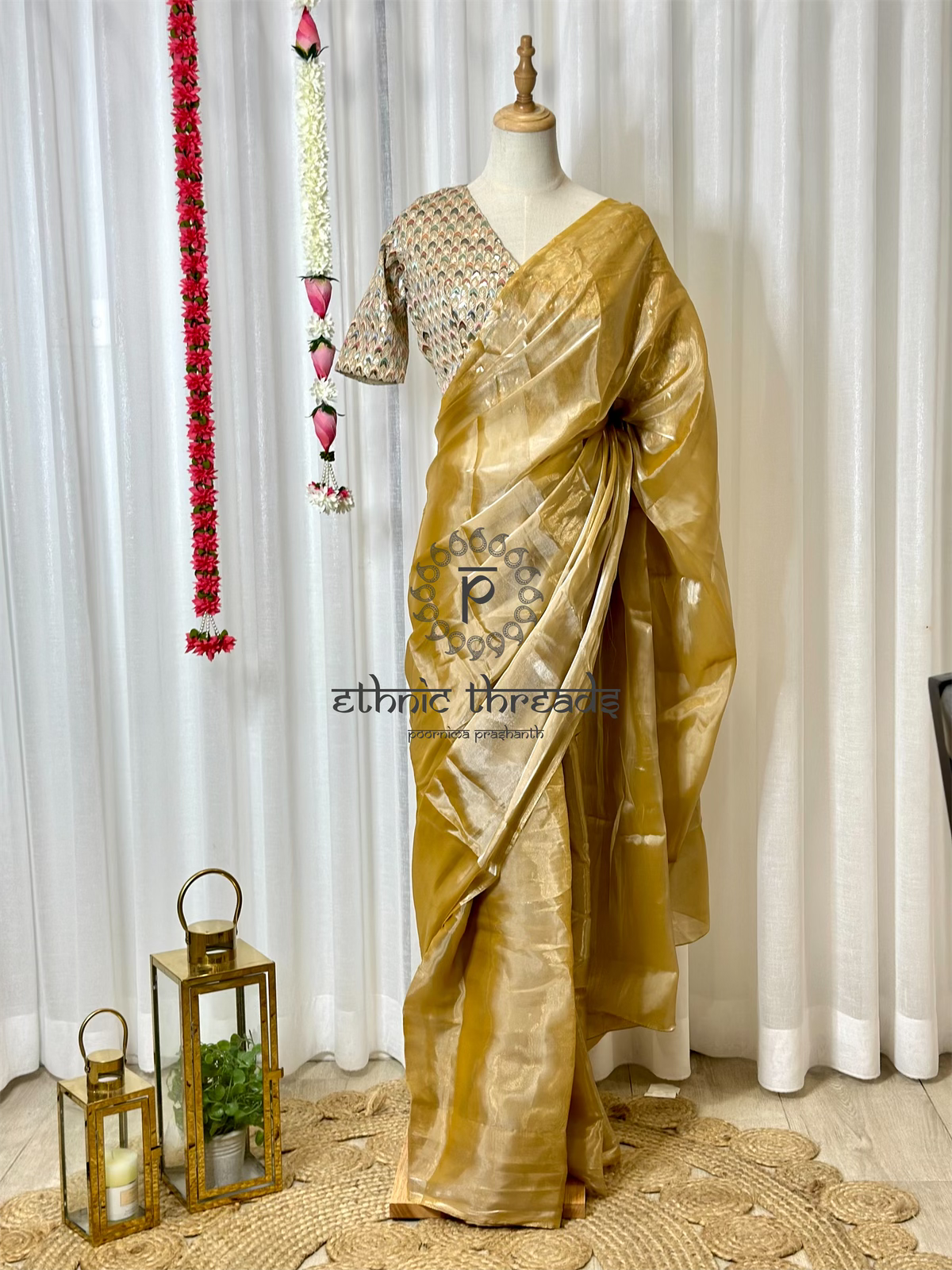 One of the Fine glossy tissue saree in brown colour with with pre-stitched pleats and adjustable loop to fit from size S to 2xl